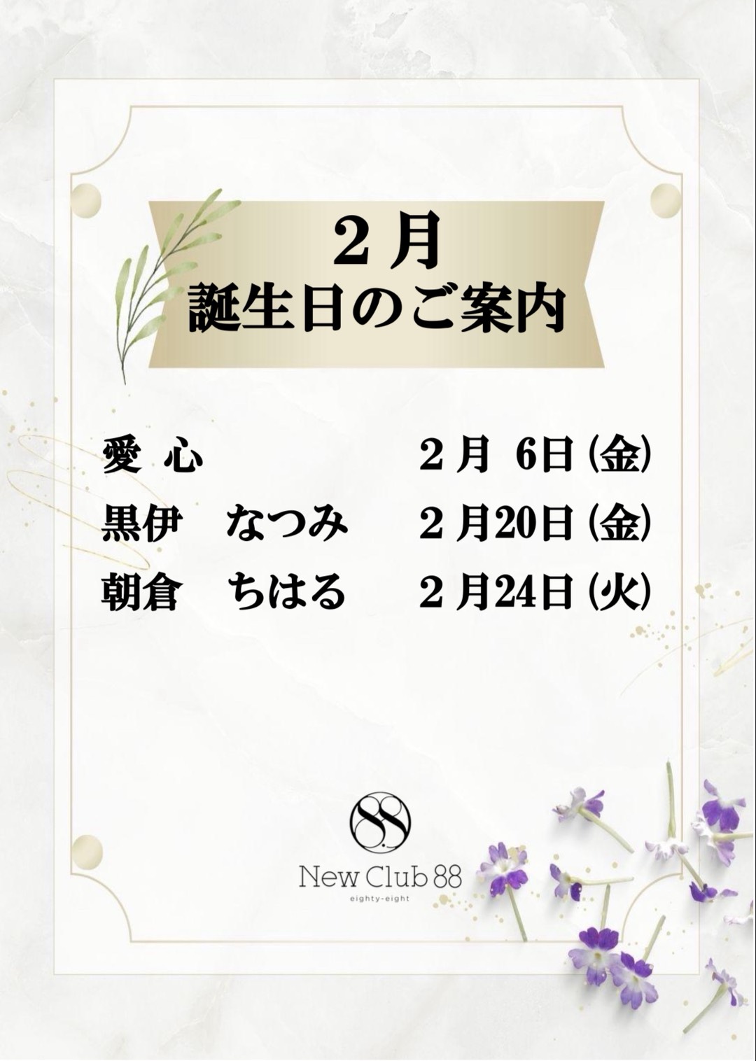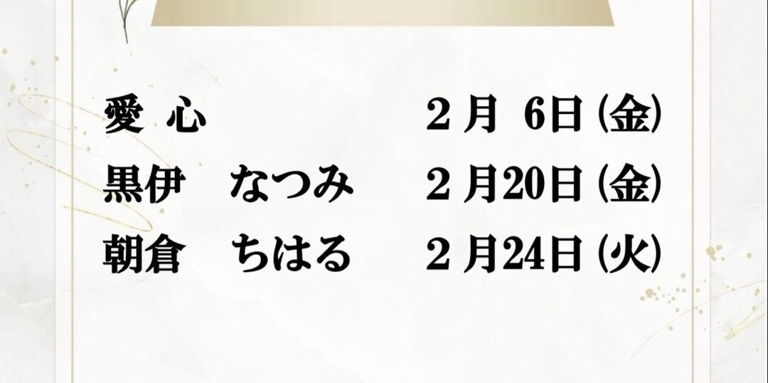 1月 バースデーのお知らせ2026年1月10日new_club_88バースデーイベント日頃のご愛顧への感謝の気持ちを込めて、心温まるひとときをご用意しております。寒さ厳しい時期ではございますが、ご都合がよろしければぜひお立ち寄りくださいませ。スタッフ一同、皆様のご来店を心よりお待ち申し上げております。