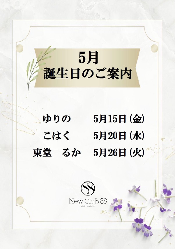 5月 バースデーのお知らせ2026年4月24日new_club_88バースデーイベント日頃のご愛顧への感謝を込めて、ささやかなひとときをご用意しております。風薫る爽やかな季節となりました。お時間がございましたら、ぜひお気軽にお立ち寄りください。スタッフ一同、皆さまのご来店を心よりお待ちしております。